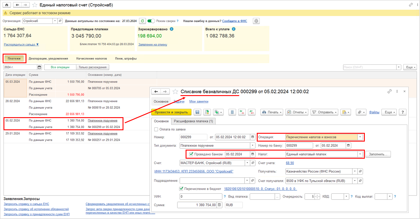 В разделе Платежи выводится информация о пополнении счета посредством единых налоговых платежей по данным ФНС и по данным организации. С данными ФНС о платежах сопоставляются отраженные в регламентированном учете документы Списание безналичных денежных средств с операцией Перечисление налогов и взносов, типом налога Единый налоговый платеж и установленным признаком Проведено банком. Если данные успешно сопоставлены, то по гиперссылке Платежное поручение можно открыть соответствующий документ.