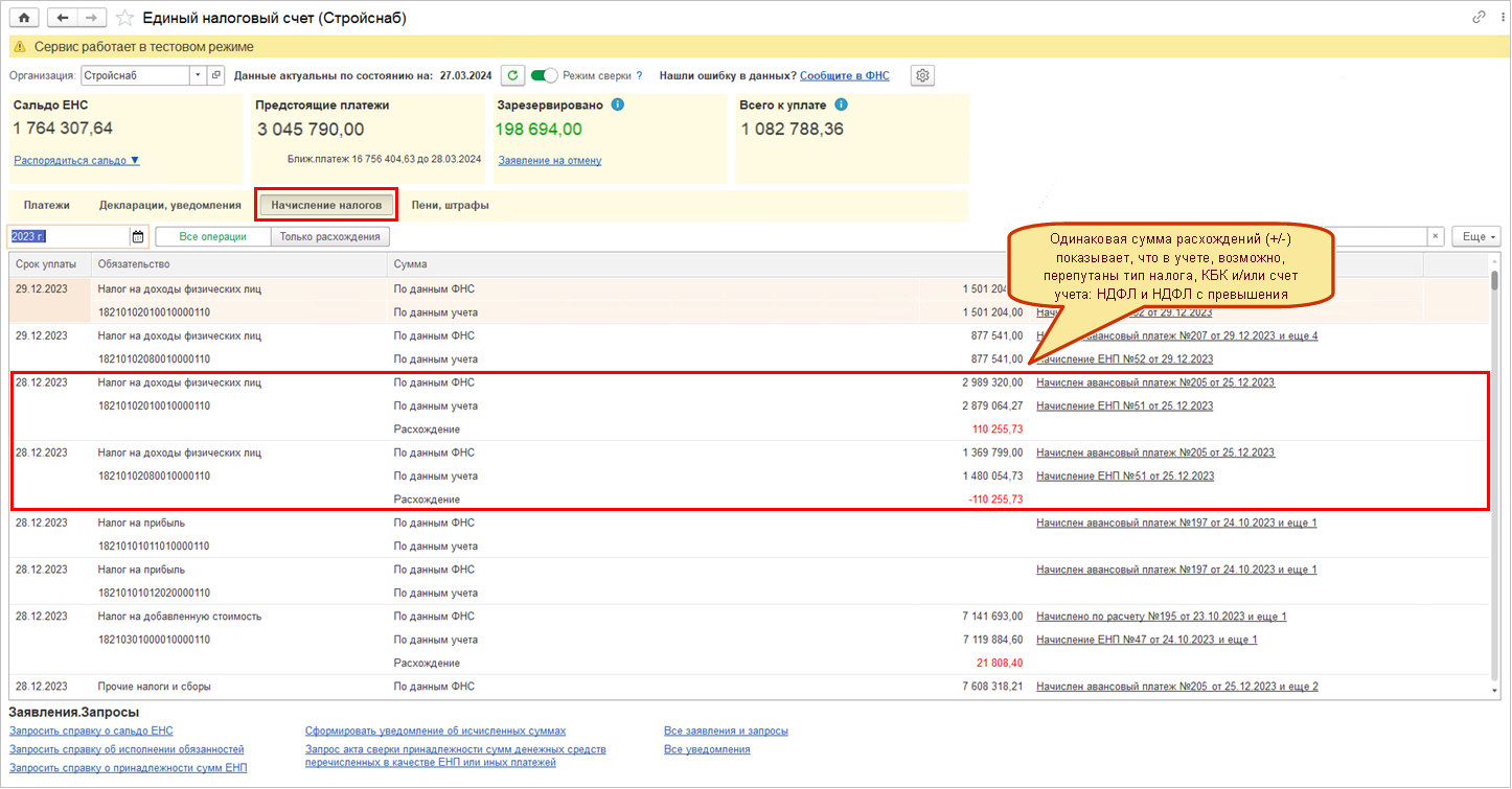 В разделе Начисление налогов выполняется сопоставление операций, формирующих каждое обязательство по уплате налога, по данным ФНС и по данным учета. С данными ФНС по ЕНС сверяются обороты по кредиту счета 68.90 «Единый налоговый счет», сформированные документами Начисление ЕНП, Корректировка расчетов по налогам, Операция (регл. учет). Сопоставляются виды обязательств (анализируются тип налога, счет учета и КБК) и сроки уплаты. Анализ расхождений данного раздела позволяет обнаружить различные учетные ошибки (см. пример на рисунке).