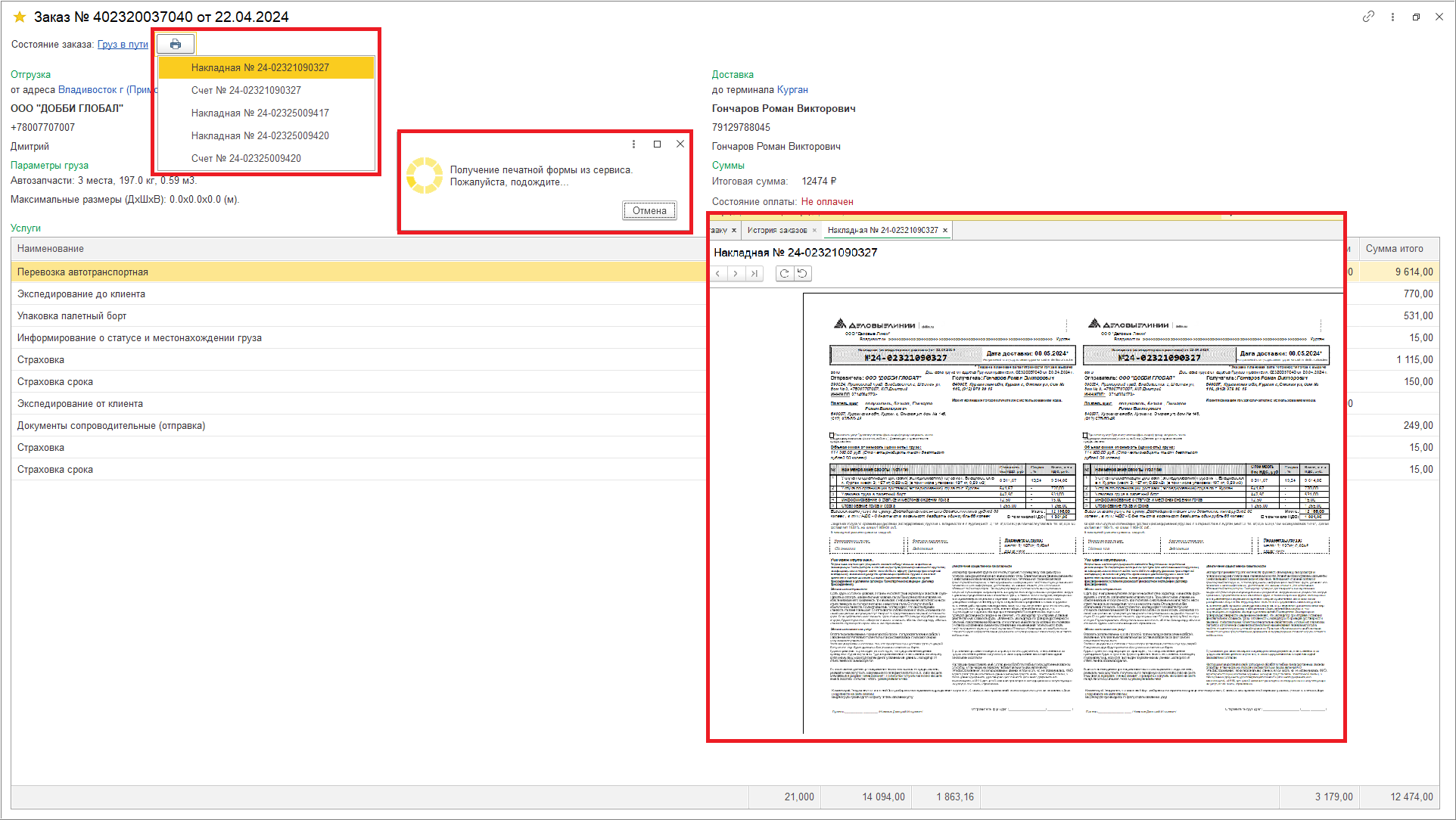В карточке заказа также предусмотрена возможность просмотра печатных форм средствами 1С (документы сервиса получаются в формате pdf). В веб-клиенте печатные формы будут сохранены как файлы.