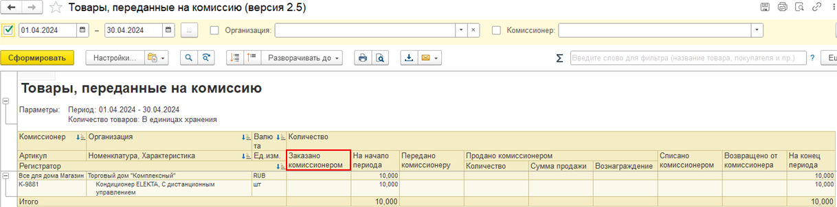 Изменено заполнение колонки «Заказано комиссионером» в отчете Товары, переданные на комиссию (версия 2.5):