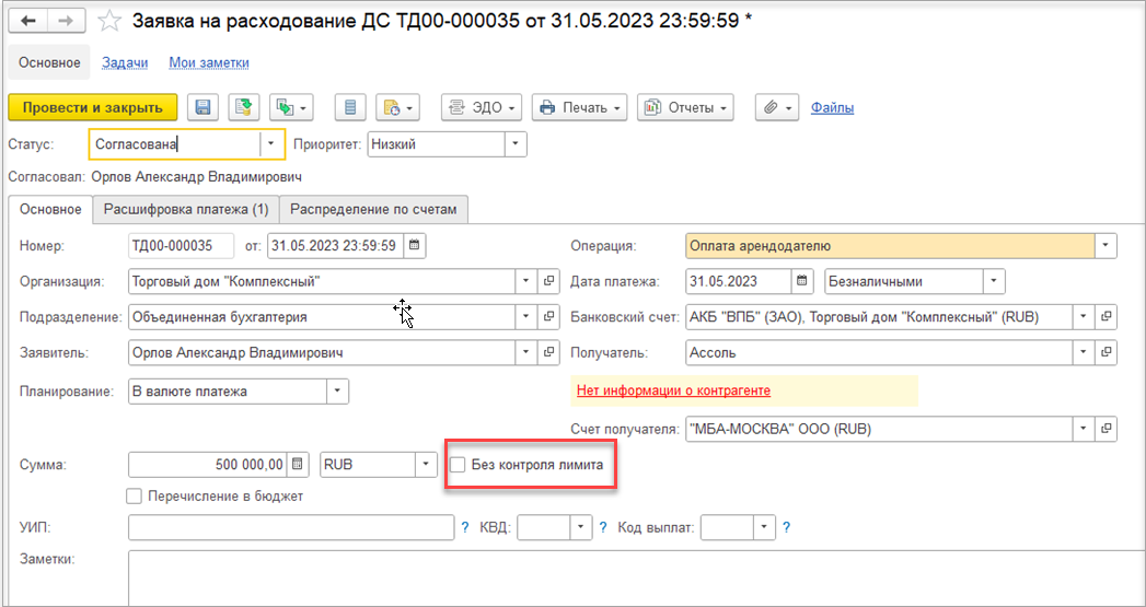 В заявках на расход денежных средств и заявках на командировку флаг Сверх лимита для нового алгоритма называется Без контроля лимита. При его установке контроль лимитов отсутствует, но сумма по действующим лимитам списывается.