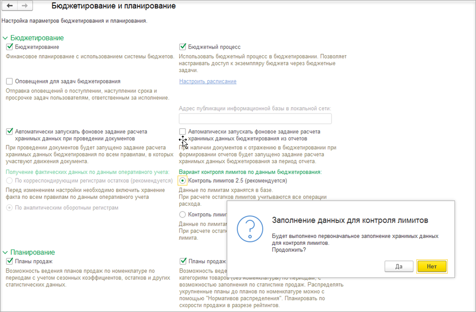 При выборе варианта Контроль лимитов 2.5 программа предложит выполнить заполнение регистра «Лимиты по данным бюджетирования» и обработку правил получения факта в фоновом режиме. Заполнение регистра происходит без контроля лимитов.