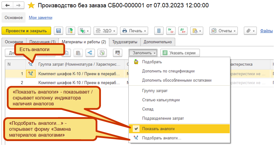 В документе Производство без заказа на закладке Материалы командой Заполнить – показать аналоги включается видимость колонки, в которой отображается наличие разрешений на замену, допускающих применение аналогов. По команде Заполнить – Подобрать аналоги открывается диалог “Замена материалов аналогами”, в котором можно осуществить замену.