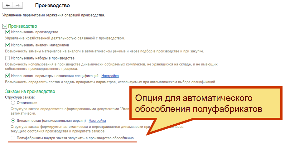 При включении этой опции полуфабрикаты внутри заказа будут производиться для своего заказа обособленно, даже если в карточке номенклатуры и в спецификации не указано обособленное обеспечение. Но при этом сохранится возможность при построении динамической структуры использовать свободные запасы таких полуфабрикатов, если они есть. При формировании этапов, которые потребляют такие полуфабрикаты, система будет автоматически определять необходимость указать обособление в зависимости от доступности остатков полуфабрикатов.