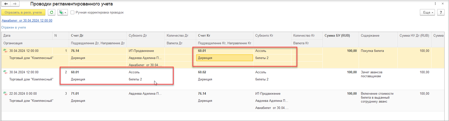 и список операций по данным учета.