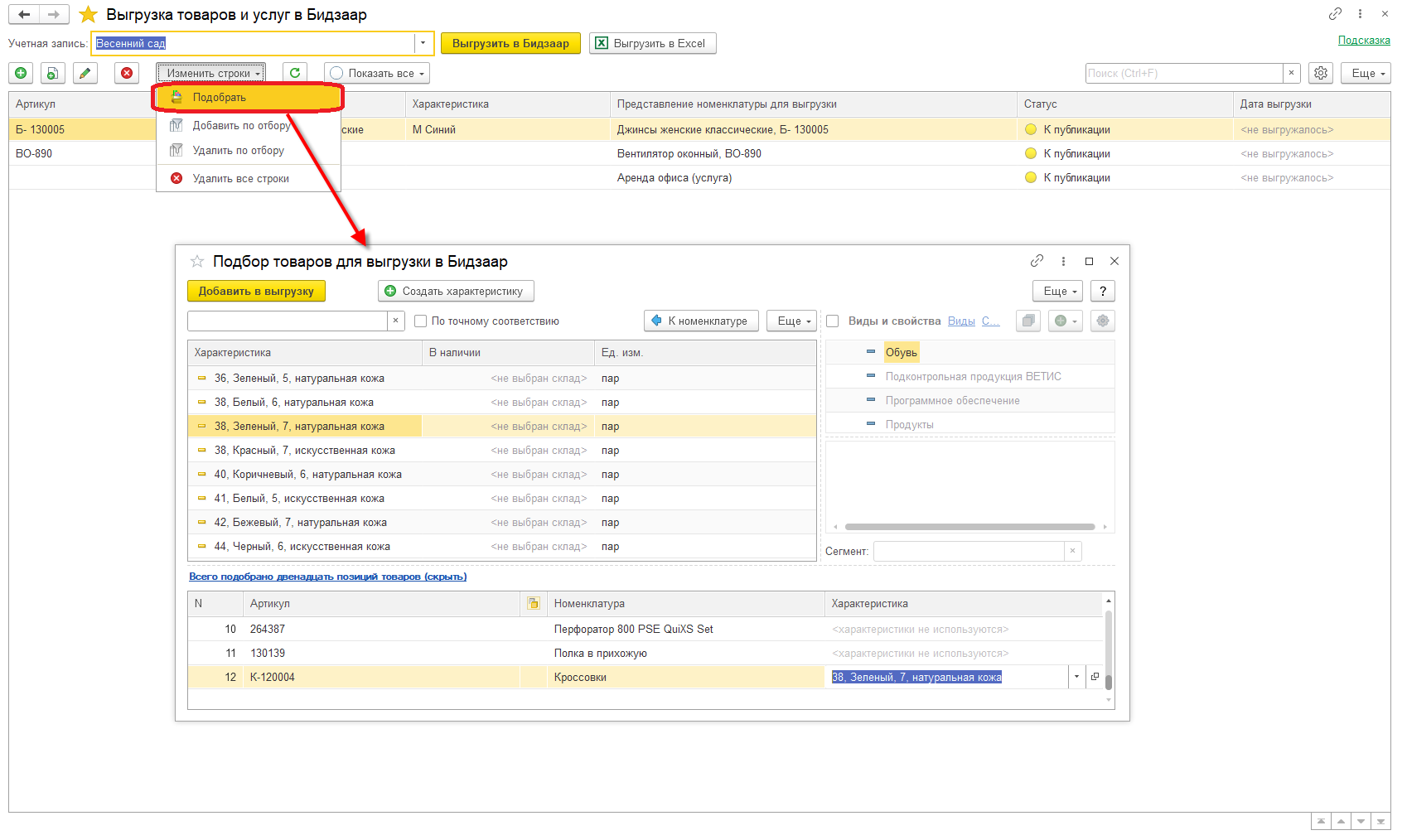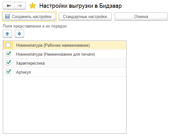 Кнопка Подобрать открывает форму подбора товаров, которая поддерживает настройку списка с сохраняемыми настройками пользователя. Перенесутся в форму выгрузки данных и для них будет сформировано Представление номенклатуры для выгрузки согласно уставленным настроек.