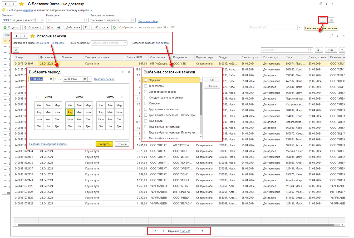 В форме списка заказов на доставку добавлено уведомление о необходимости перехода на новый тип авторизации. При неудачной попытке авторизации пользователь получит уведомление. После успешного подключения форма параметров авторизации закроется, а список заказов обновится.