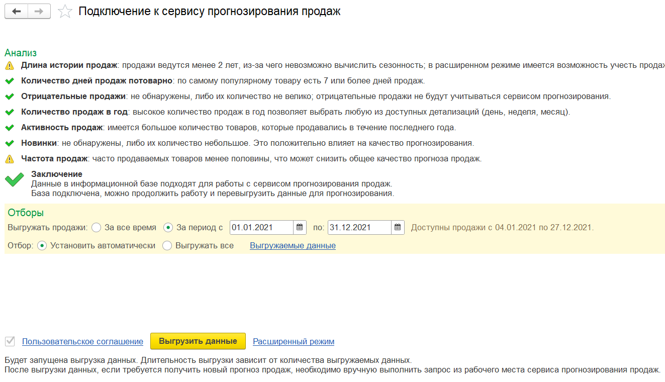 ■ Перед выгрузкой данных в сервис прогнозирования и построением прогноза возникает необходимость проверить корректность выгружаемых данных. Отправляются ли на сервер продажи по товарам, по которым ожидается прогноз? И напротив, не выгружаются ли позиции, давно выведенные из оборота? Для такой возможности реализован отчет по выгружаемым данным.