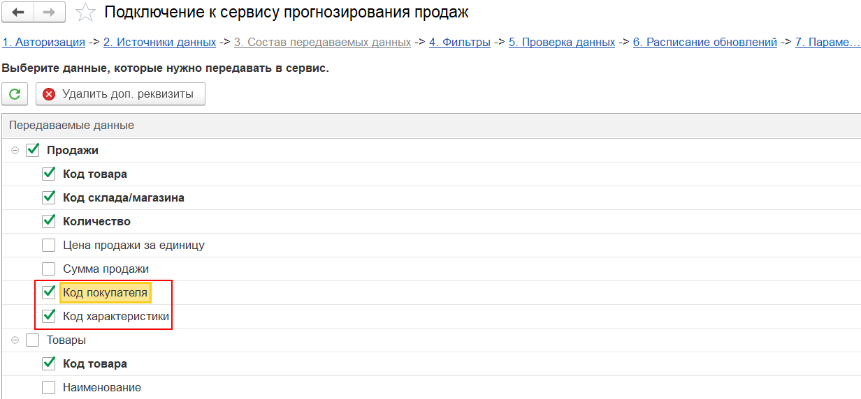 В помощнике подключения к сервису прогнозирования продаж в расширенном режиме на этапе 4 «Фильтры» добавлены новые отборы:
