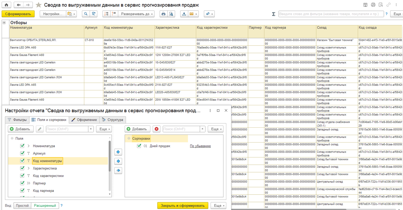 В сервис прогнозирования выгружаются идентификаторы, а наименования по умолчанию не выгружаются. Поэтому часто невозможно задать вопрос о прогнозе, например, по товару «Лампа LED ЭРА A60». Требуется сообщить идентификатор товара. Соответствующие колонки отчета призваны помочь в этом вопросе.