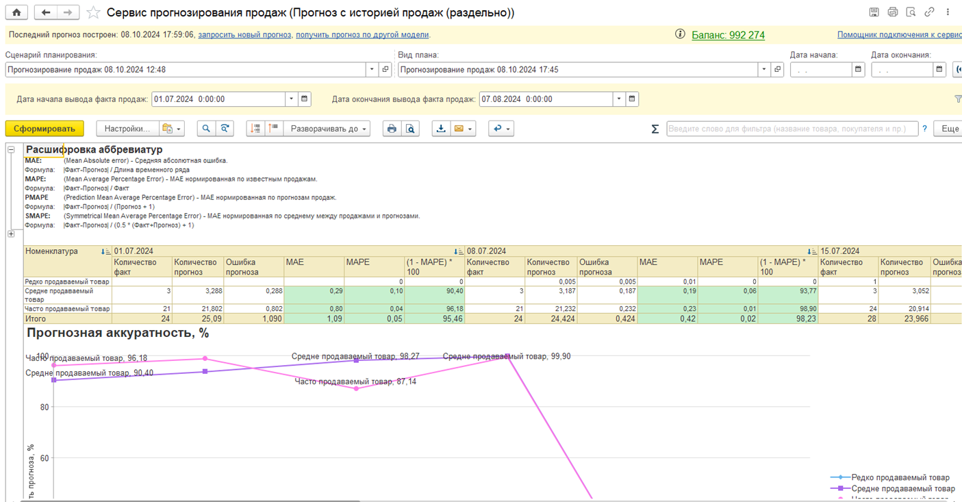 ■ Добавлена информация о качестве прогноза в вариант отчета «Прогноз с историей продаж (раздельно)».