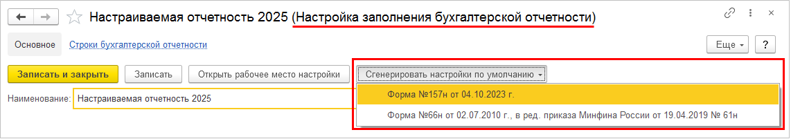 ■ сгенерировать для новой настройки бухгалтерской отчетности правила заполнения по кнопке Сгенерировать настройки по умолчанию – новая команда Форма №157н от 04.10.2023;