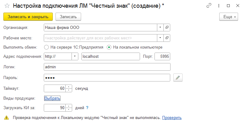 При создании новой настройки предварительно заполняется адрес подключения согласно параметрам установки Локального модуля «Честный знак» по умолчанию.