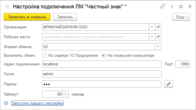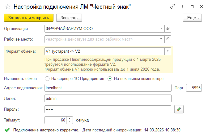 При обновлении по всем имевшимся настройкам подключения ЛМ ЧЗ устанавливается единственно возможный ранее формат обмена V1. Для версии 1 выводится подсказка о необходимости перехода на версию 2.
