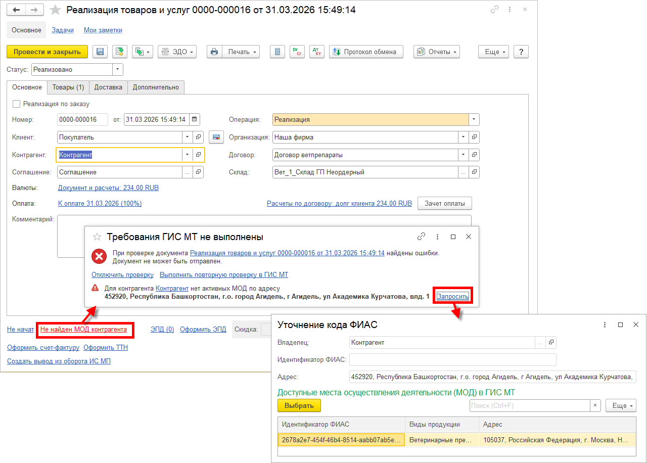 Если в результате проверки по указанному адресу МОД в ГИС МТ не найден будет отображена ссылка Не найден МОД контрагента и по ней будет предложено сопоставить адрес с активными доступными МОД по данной товарной группе в ГИС МТ. После выполнения сопоставления в ЭД будет подставляться ФИАС идентификатор корректного МОДа получателя.