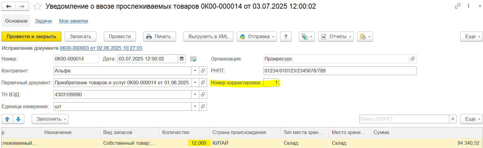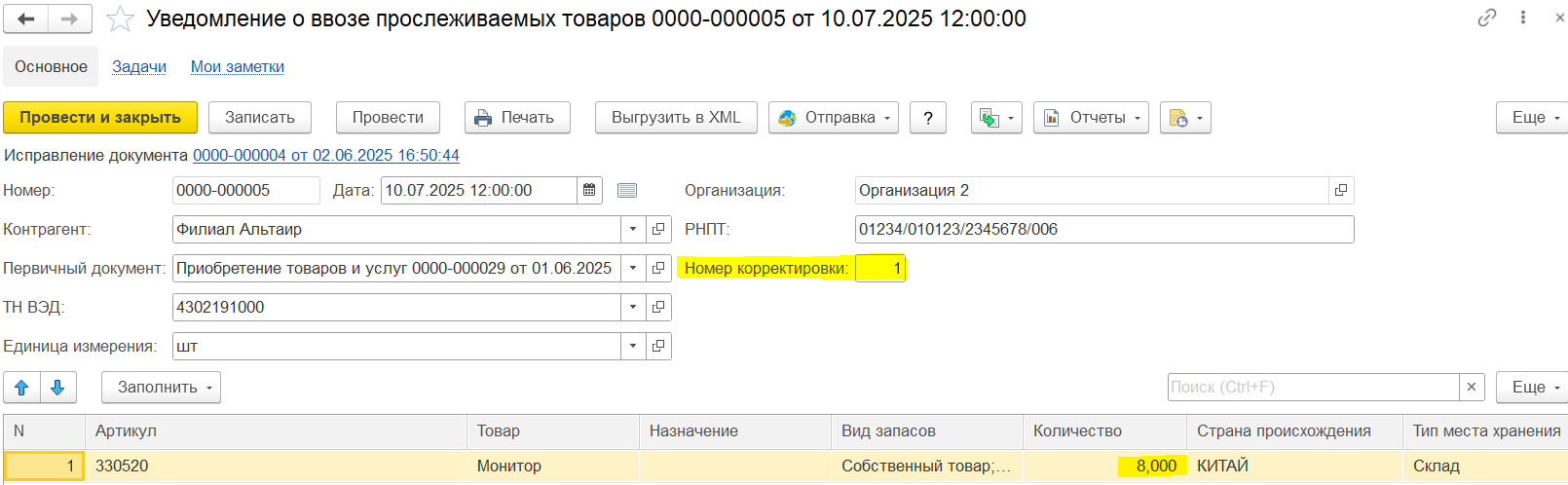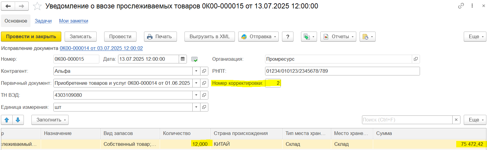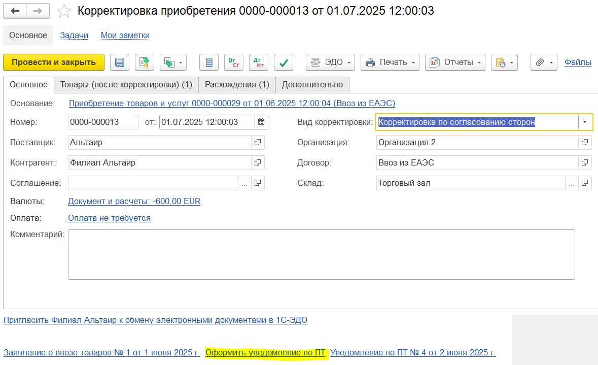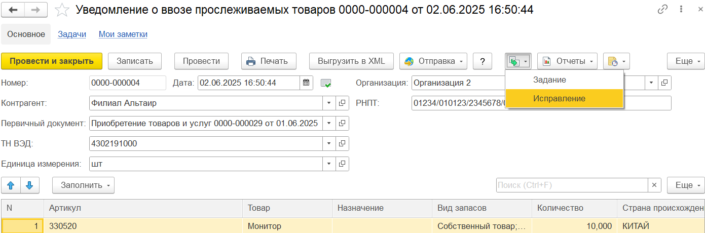 Вариант 1. Ввод на основании первичного уведомления через механизм исправления финансовых документов. Для документа Уведомление о ввозе прослеживаемых товаров предусмотрен ввод документа Исправление, который позволяет сформировать корректировочное уведомление о ввозе прослеживаемых товаров с учетом введенных корректировок приобретения по поступлению прослеживаемых товаров из ЕАЭС.
