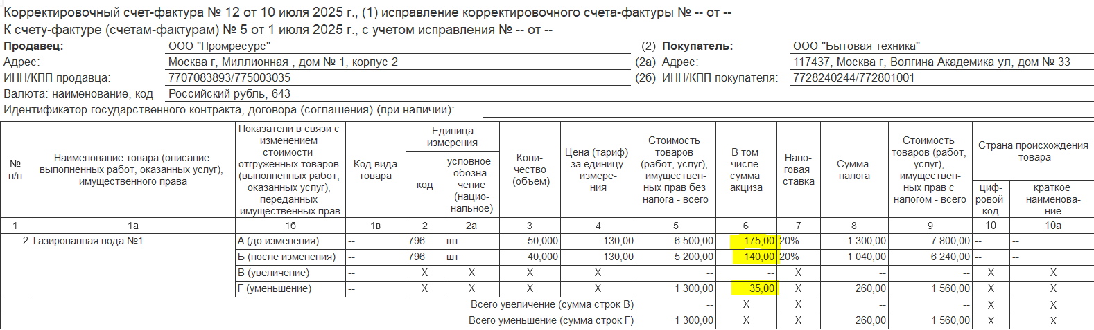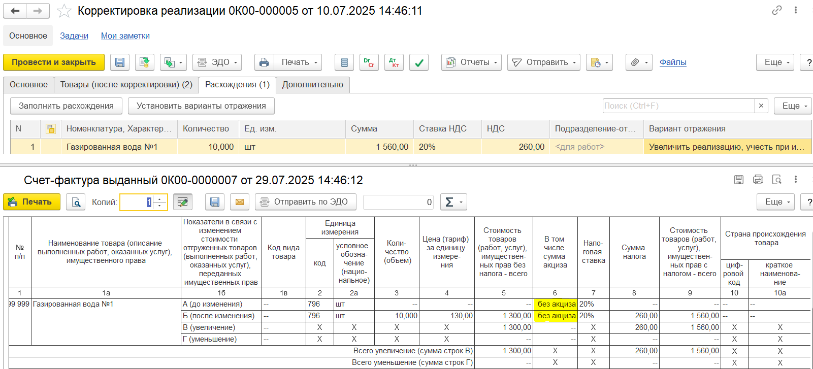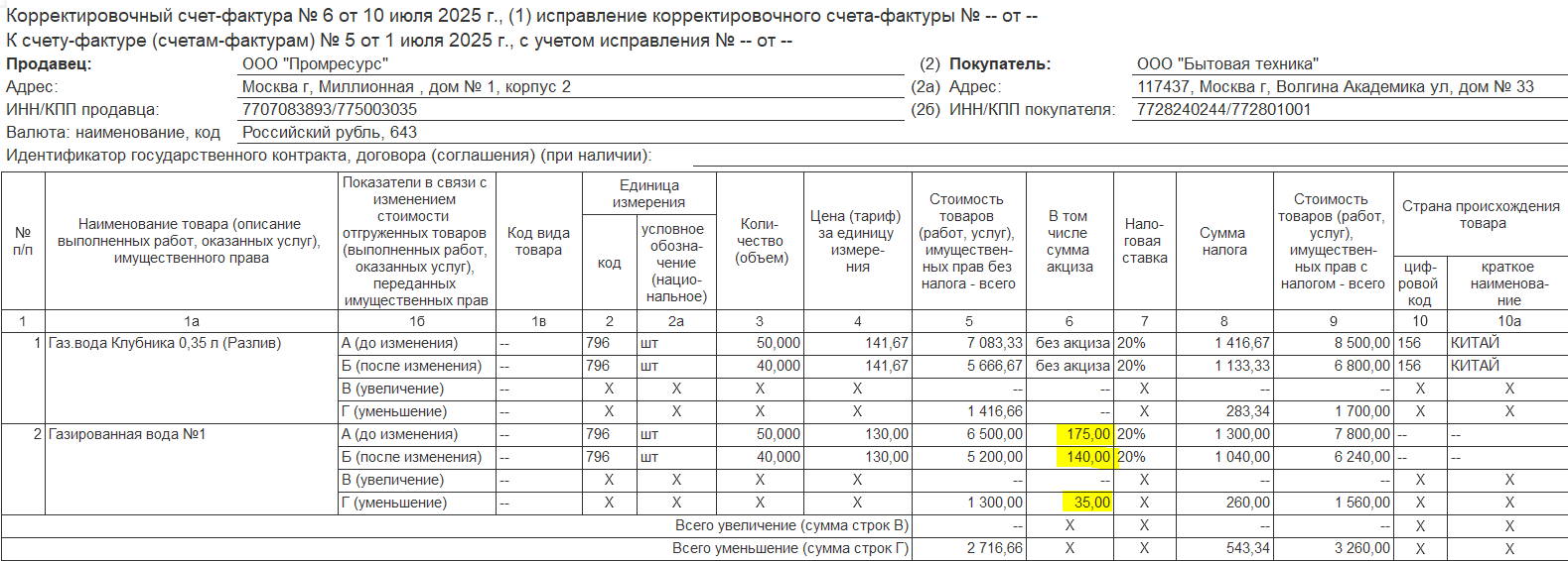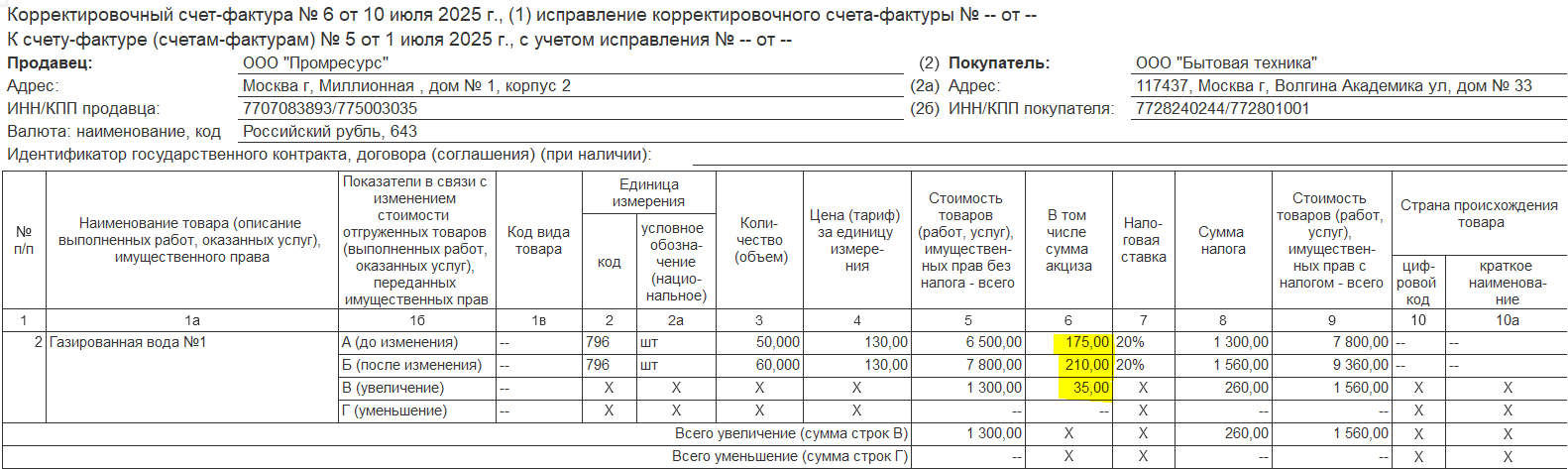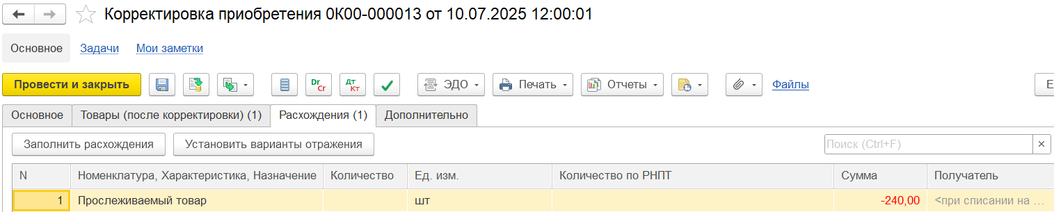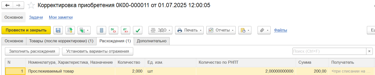 Пример 2. Корректировка на увеличение количества/уменьшение стоимости:
