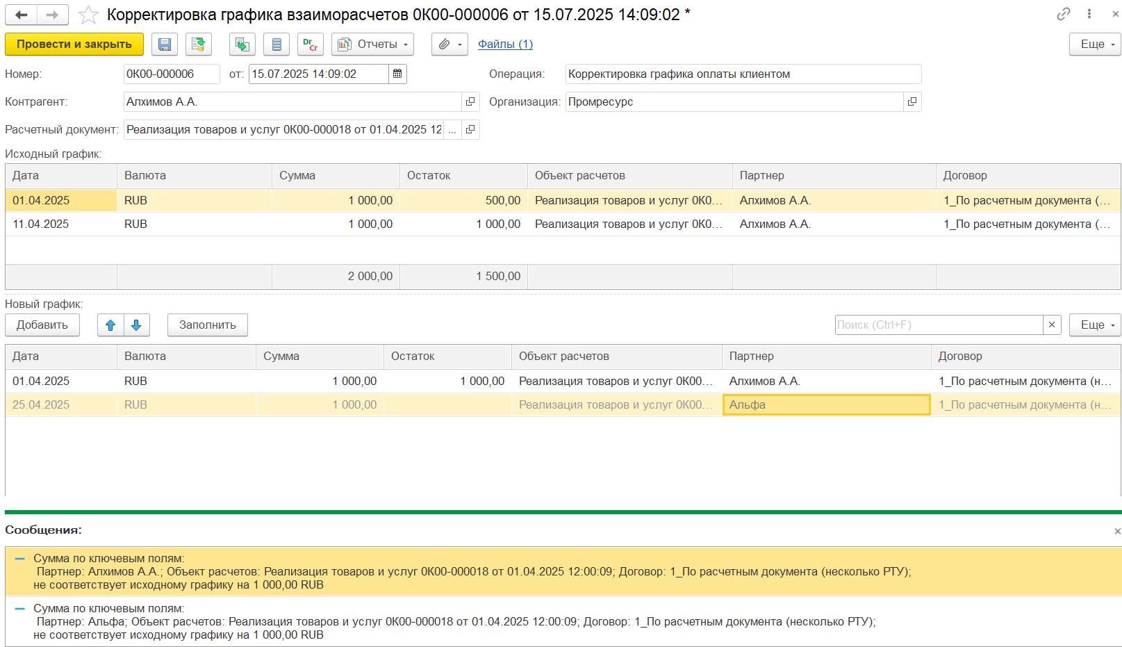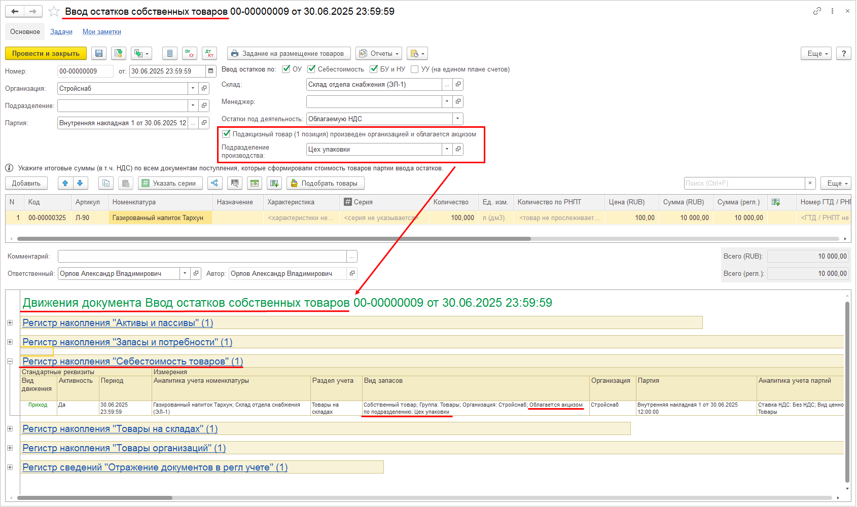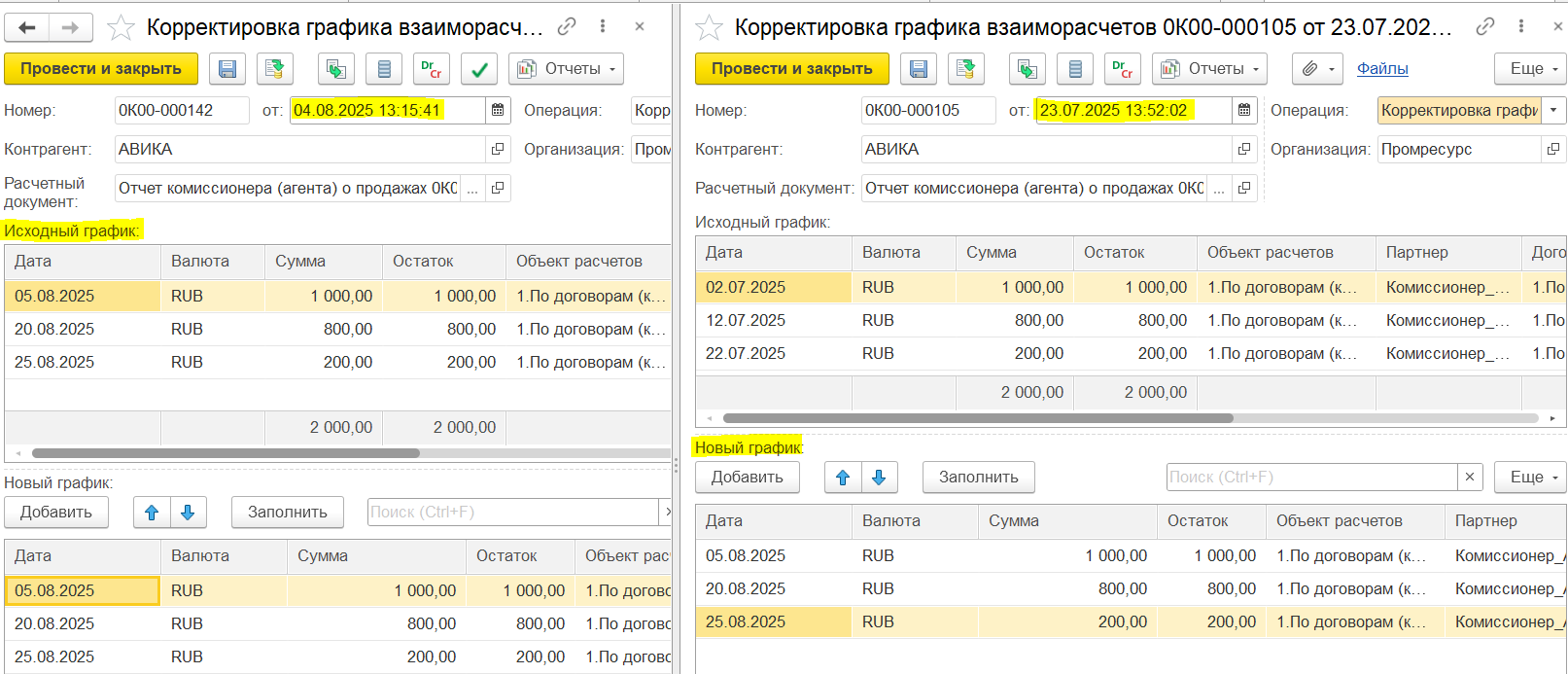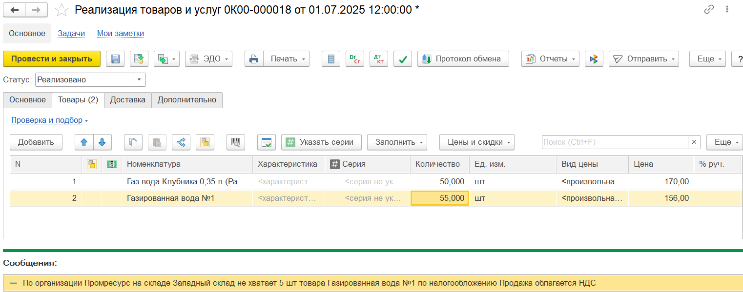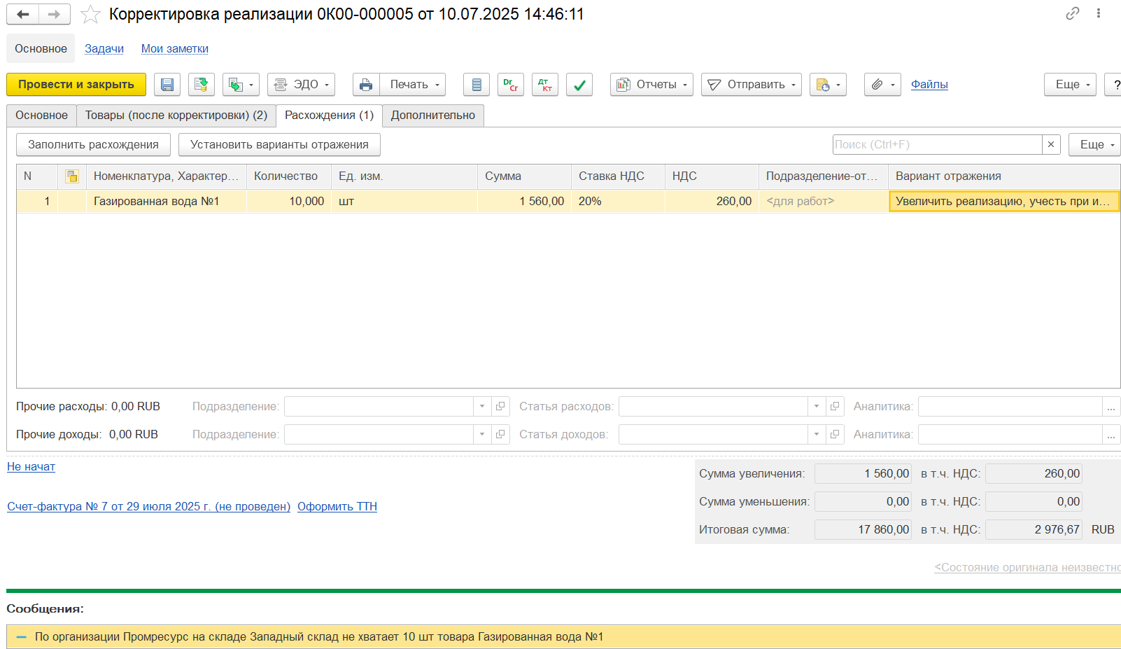 Пример 2. Корректировка на увеличение количества/уменьшение стоимости: