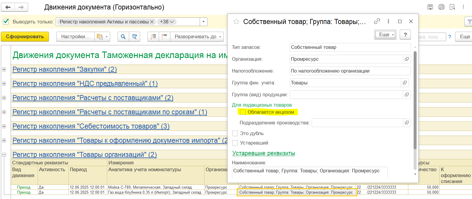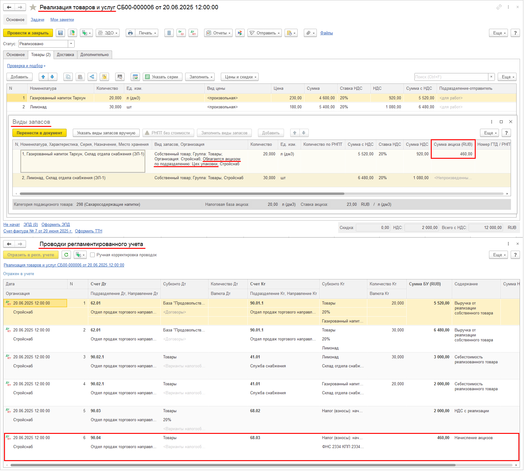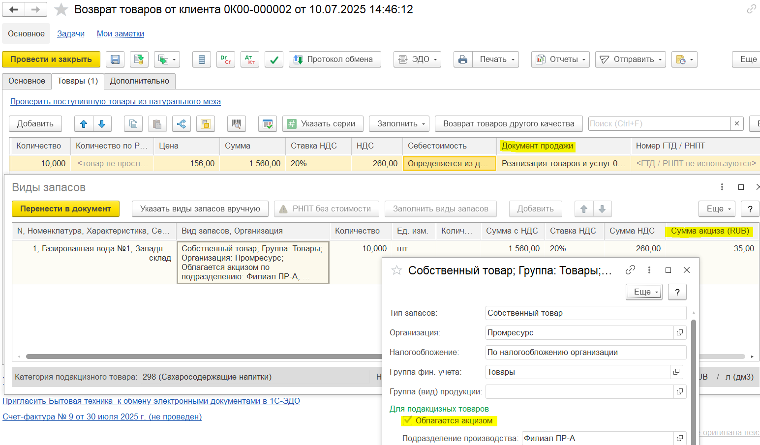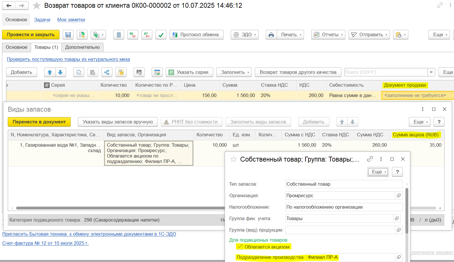 Пример 2. Корректировка на увеличение количества/уменьшение стоимости: