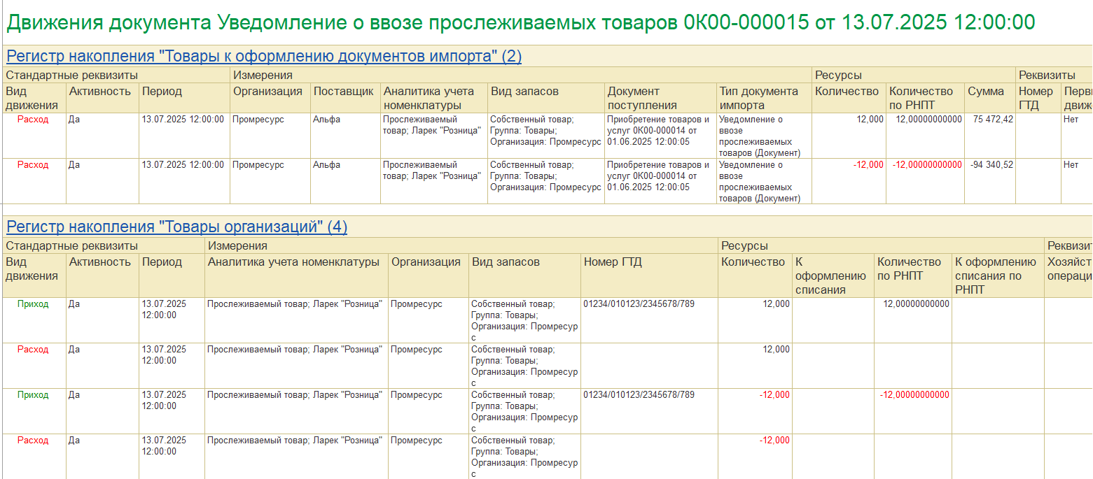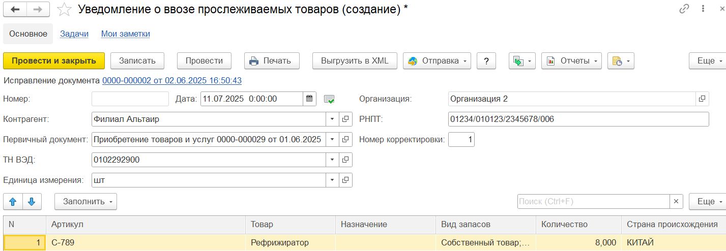 Реализован ввод и отправка в ФНС корректировочных уведомлений о ввозе прослеживаемых товаров с целью поддержки сценариев: