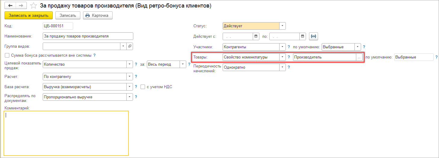 Реализован расчет бонусов, настроенных по значениям свойства номенклатуры.