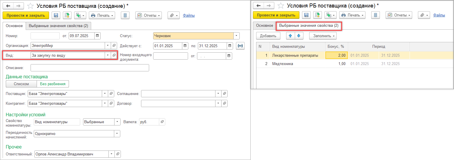 В документе Условия ретро-бонусов поставщика с настройкой товаров по свойствам на отдельной закладке указываются значения свойства номенклатуры. К выбору доступны значения свойства, выбранного в виде ретро-бонусов. Могут быть указаны через выбранные или исключённые значения.