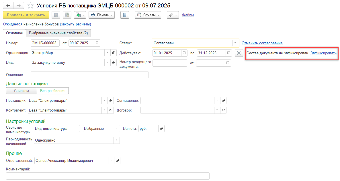 Фиксация состава документа доступна из формы документа Условия ретро-бонусов поставщика и Начисление ретро-бонусов поставщика. Фиксация состава документа разрешена только в случаях, если нет корректировки условий ретро-бонусов в статусе На согласовании.