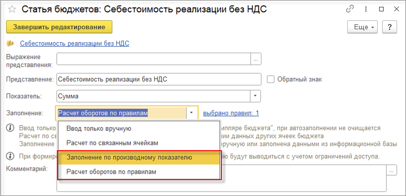 При настройке заполнения статьи бюджетов «Себестоимость реализации без НДС» выбираем новый вариант заполнения Расчет оборотов по правилам.