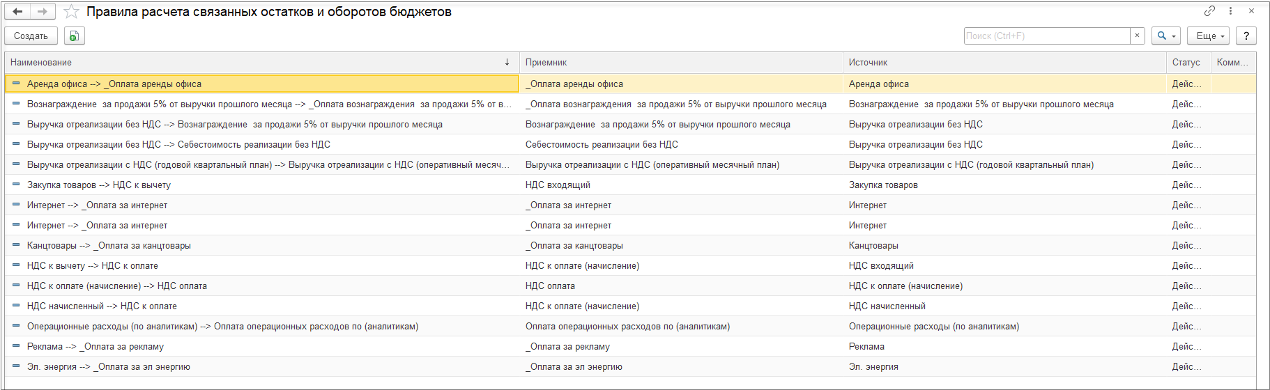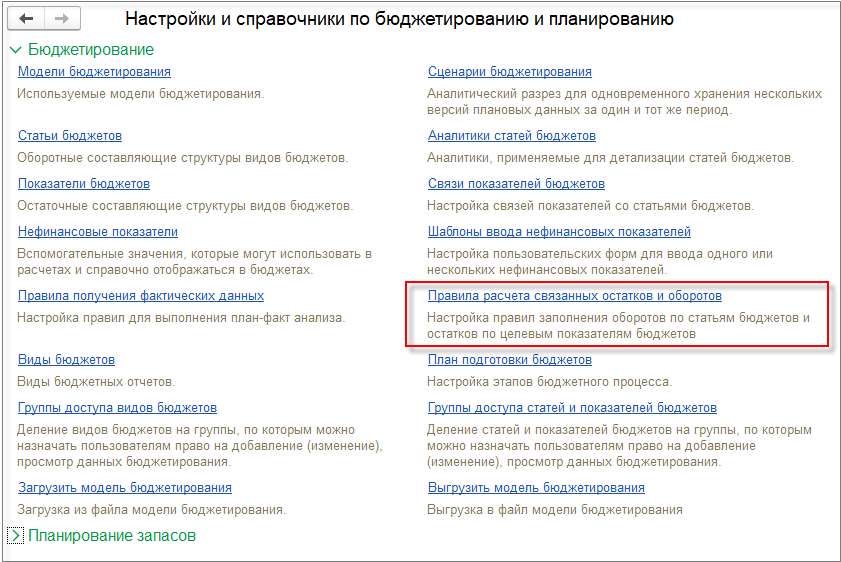 Новый справочник Правила расчета связанных остатков и оборотов бюджетов добавлен в раздел Бюджетирование и планирование - Настройки и справочники.