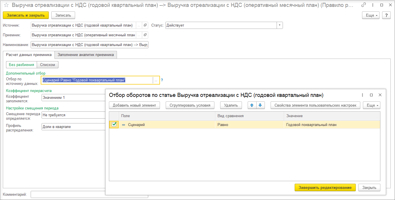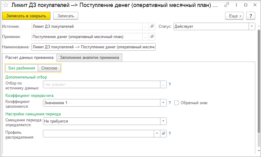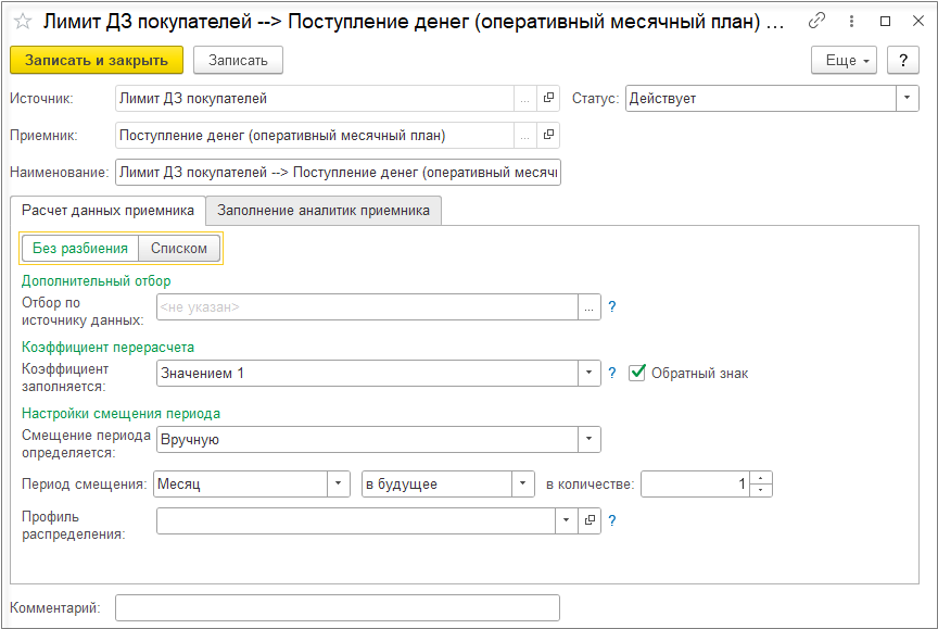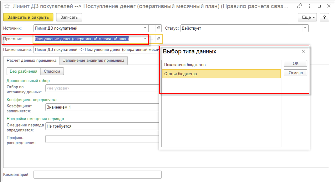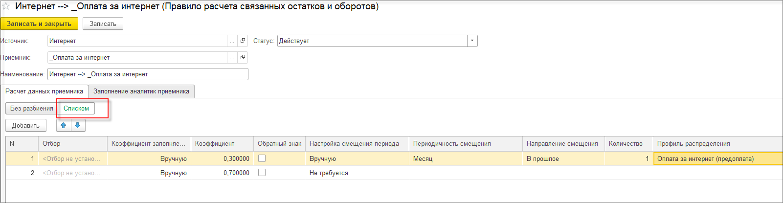 Поэтому для статьи бюджета «Оплата за интернет» настроим правило смещение периода на один месяц в будущее с оплатой 30% и 70% оплата в текущем периоде. Для этого в правиле расчета связанных остатков и оборотов на закладке Расчет данных приемника перейдем на значение переключателя Списком и установим значения коэффициента и настроим смещение периода.