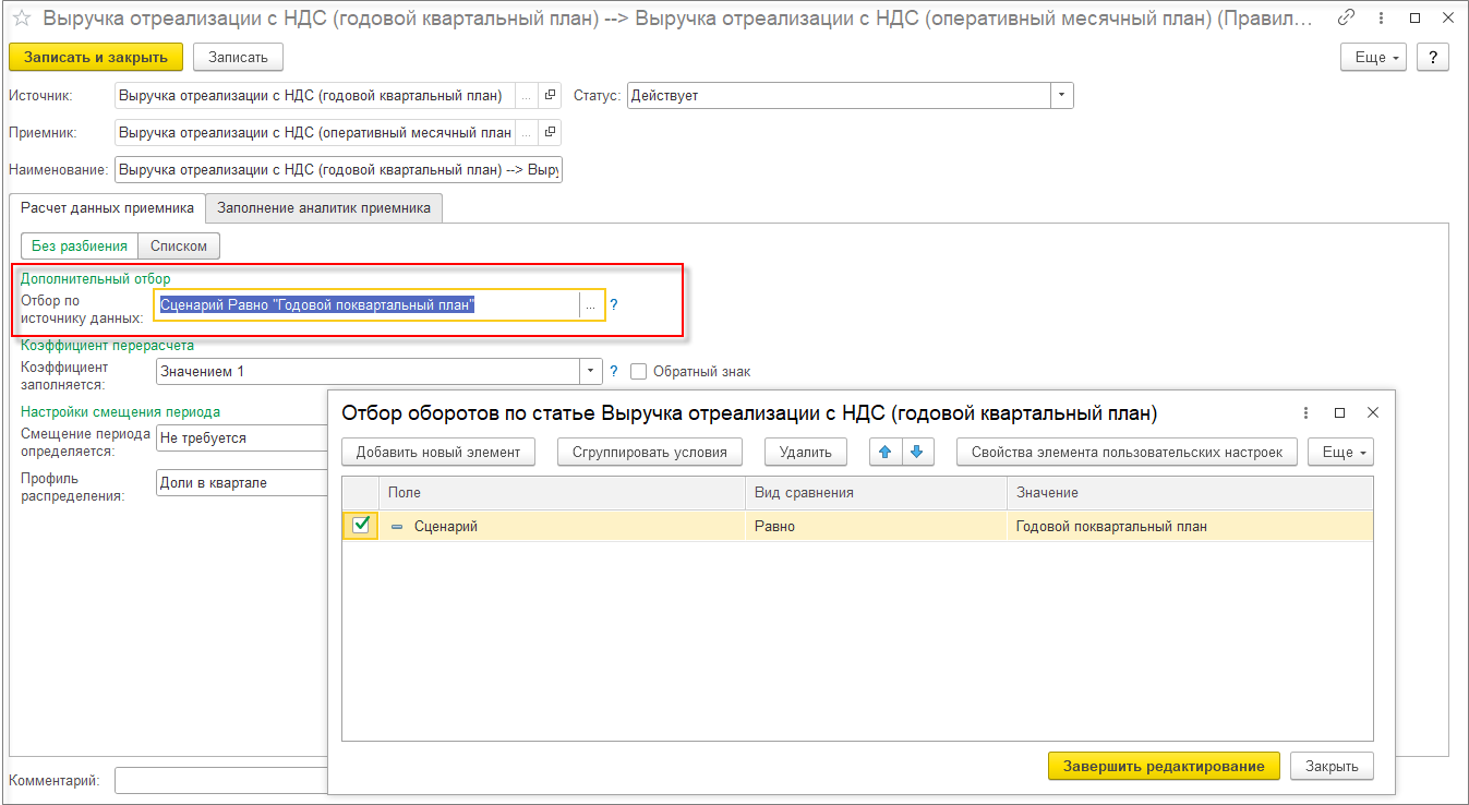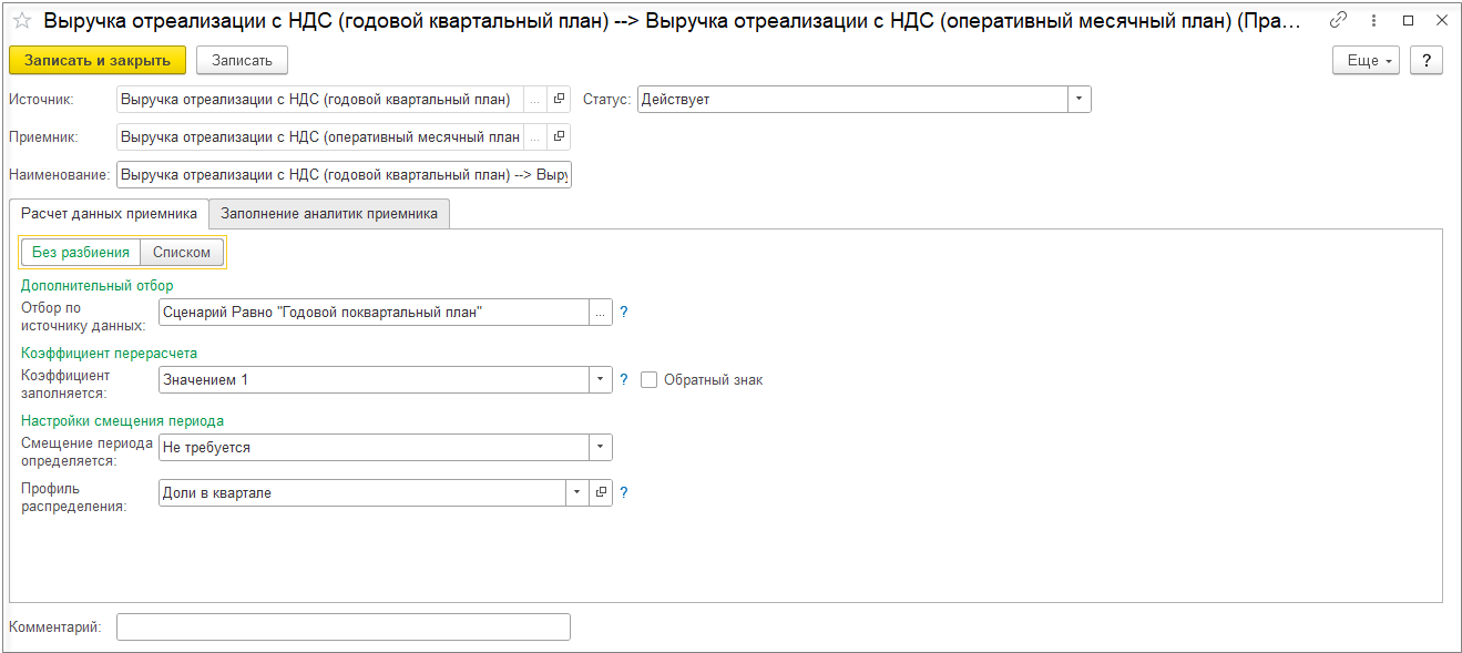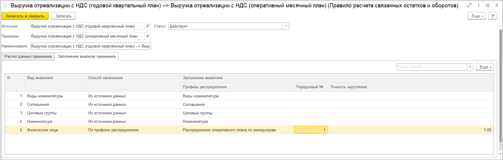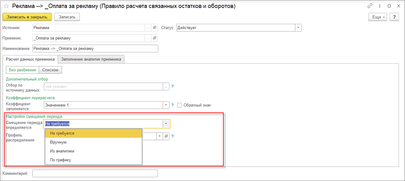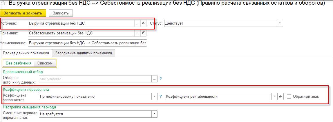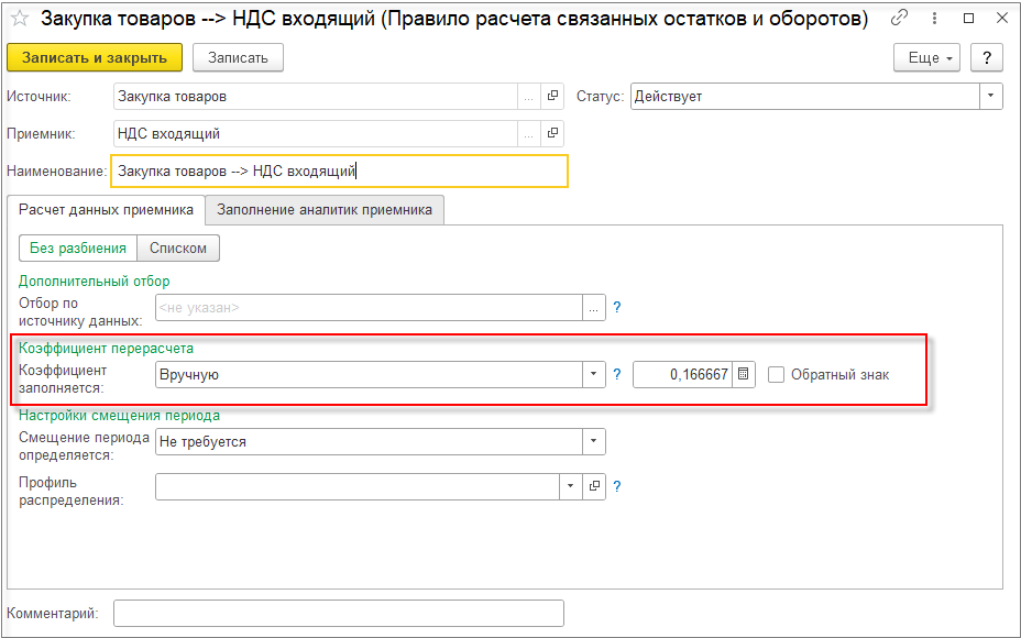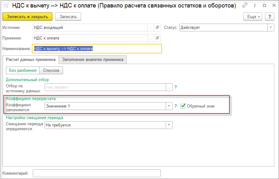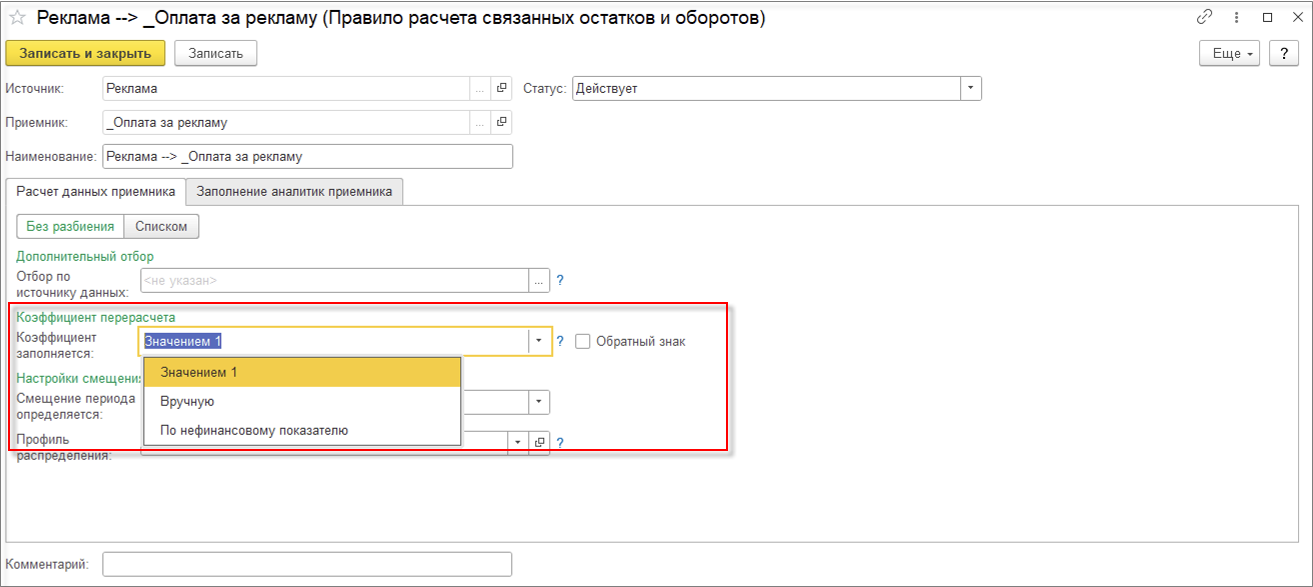 В правиле расчета связанных остатков и оборотов на закладке Расчет данных приемника в поле Коэффициент заполняется выберем Значением 1.