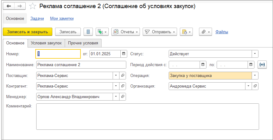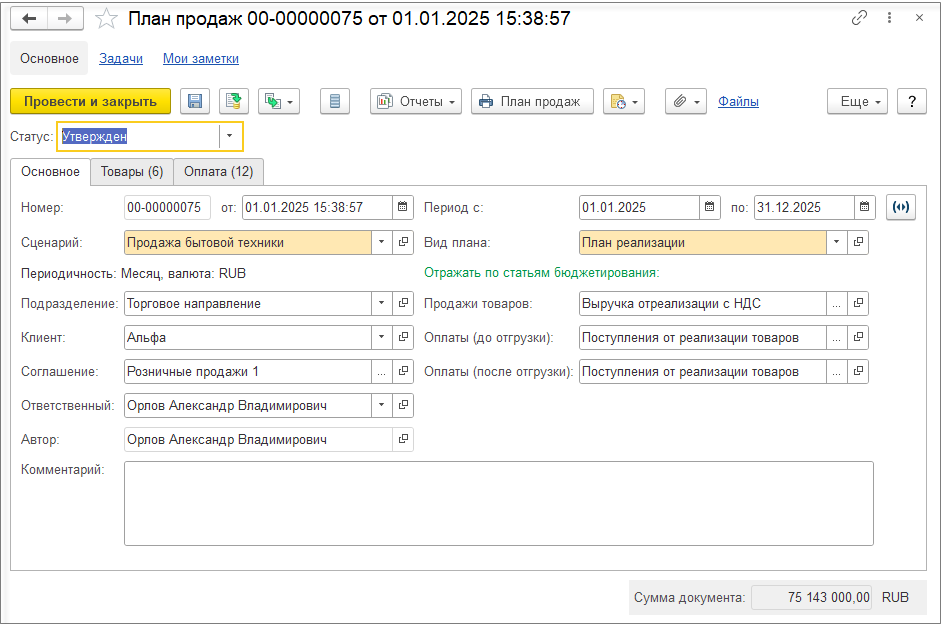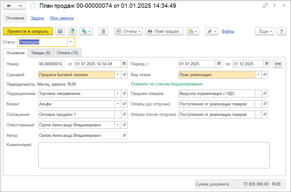 Введем план продаж в контуре планирования с заполнением соглашения «Оптовые продажи».