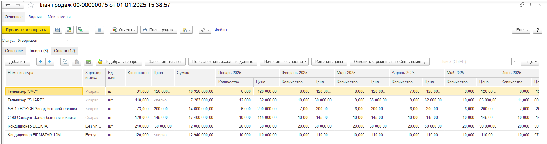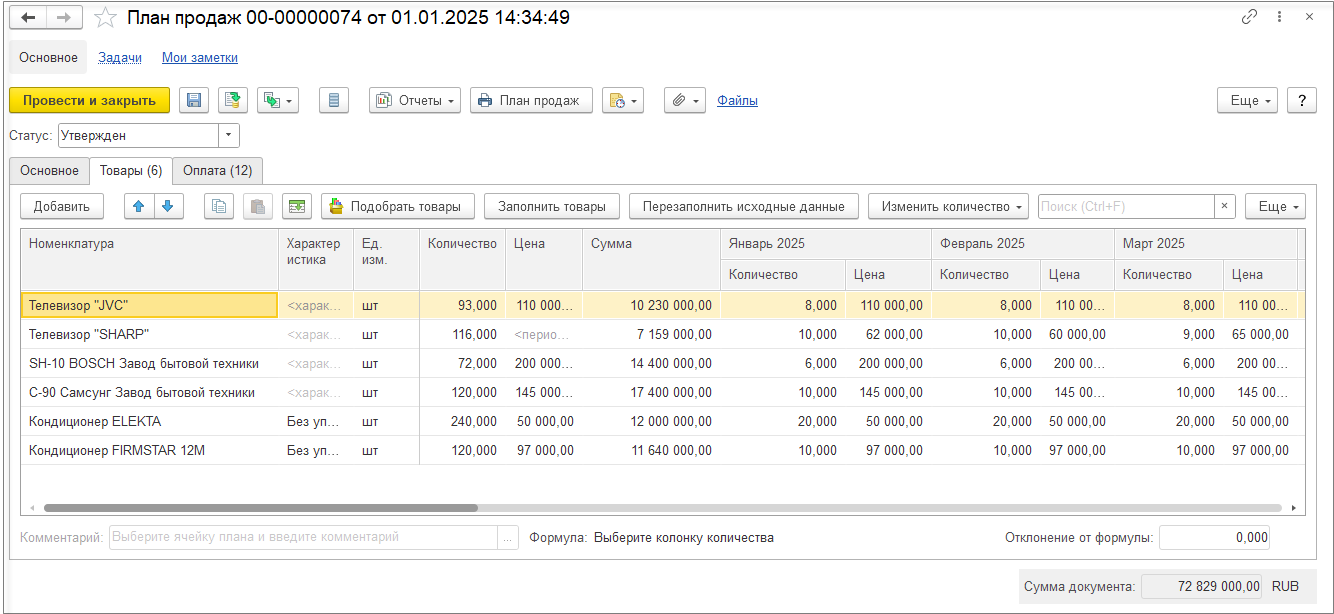 Данные для планов продаж вводим в разрезе номенклатуры и с учетом количества.