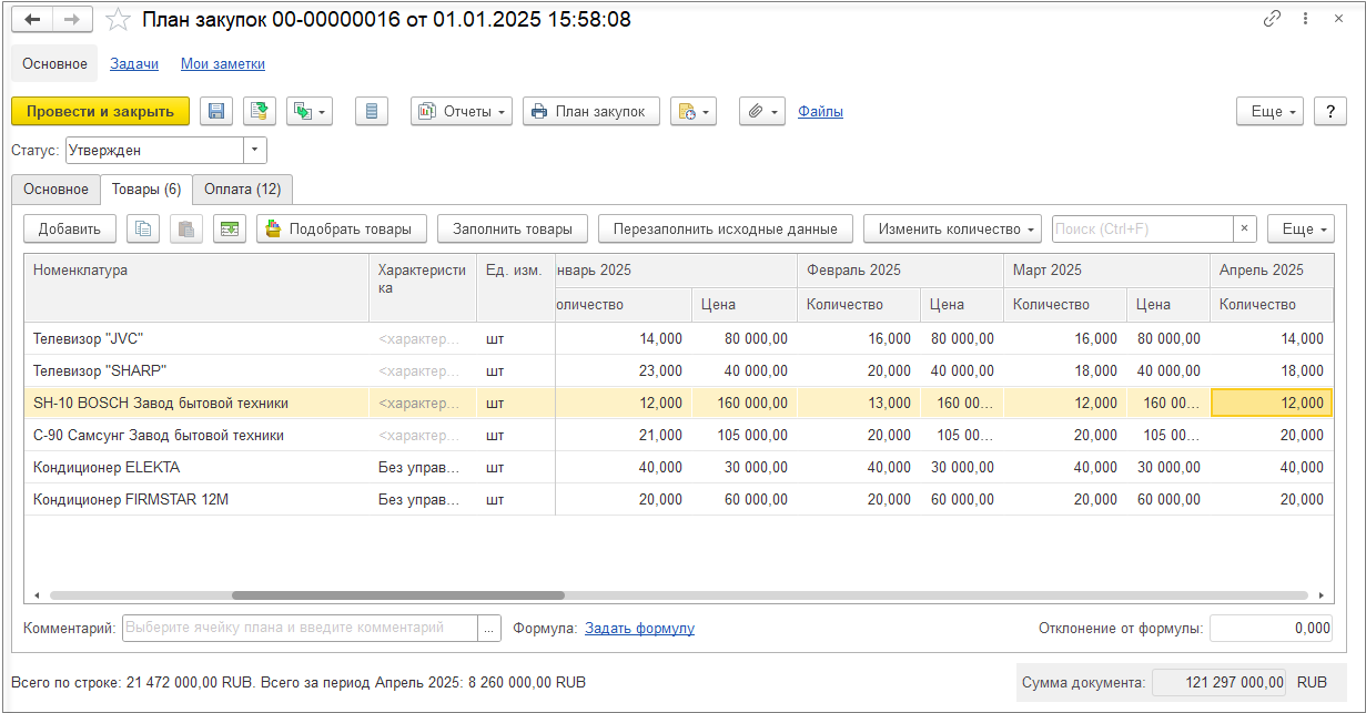 Далее рассчитаем входящий НДС. План закупок по аналогии с планом продаж введем по номенклатуре и в количественном выражении.