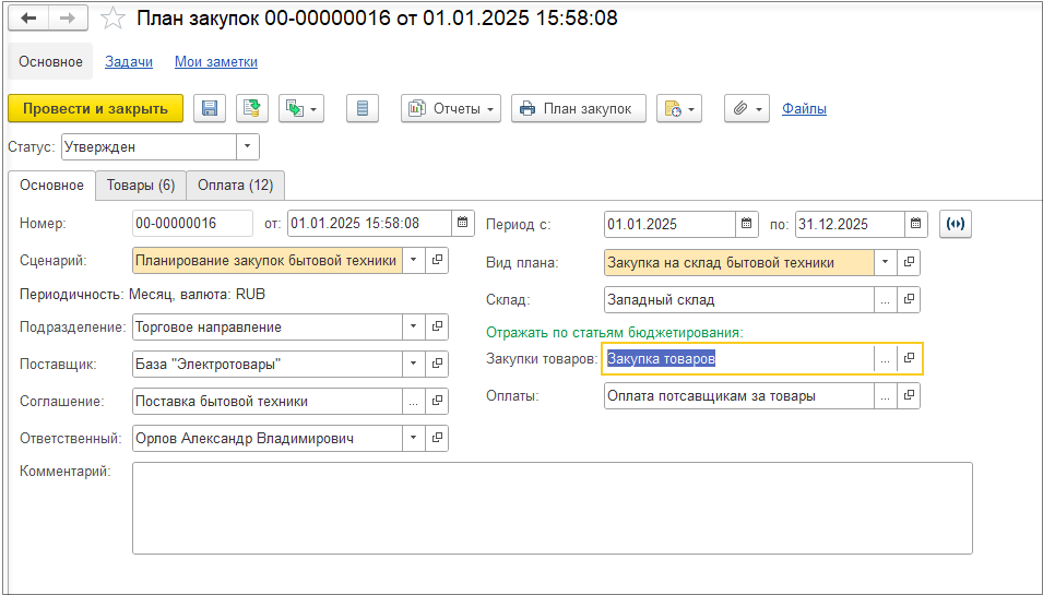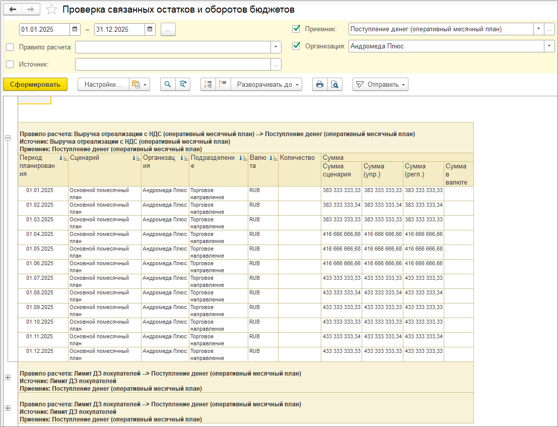 Также по аналогии с планом продаж происходит трансляция закупок и оплат в подсистему бюджетирования.