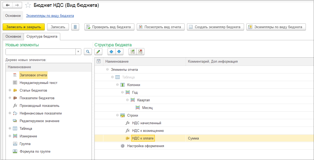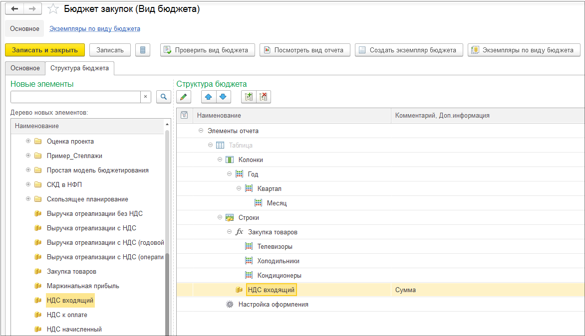 В бюджете НДС выводятся данные по начисленному и входящему НДС из операционных бюджетов: бюджет реализации товаров, бюджет закупок. Данные выводятся для информации.