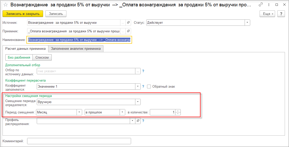 Для статьи «Оплата вознаграждения за продажи 5% от выручки прошлого месяца» настроим правило смещение периода на один месяц в прошлое, т.к. вознаграждение оплачивается в следующем месяце.