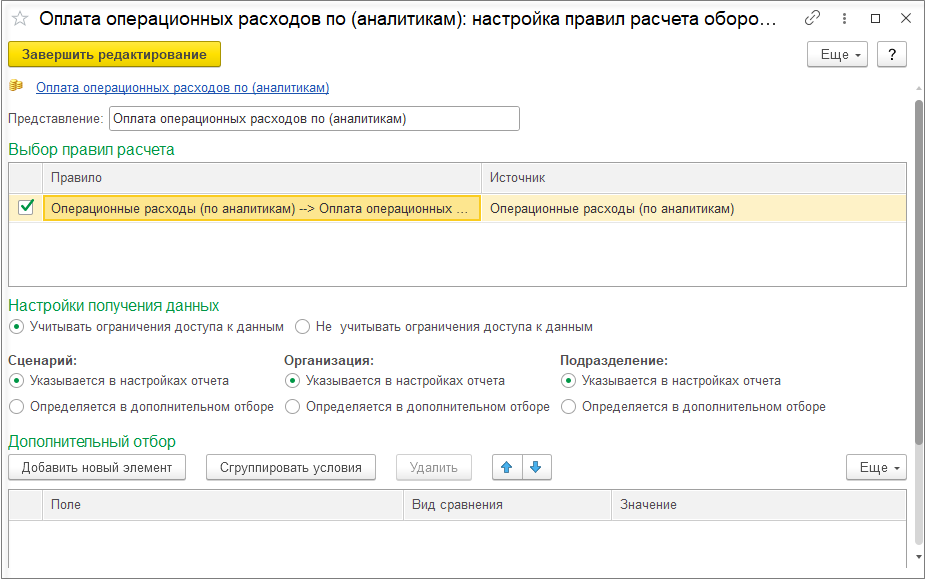 Для выбора доступны все действующие правила, сформированные для расчета оборотов по статье «Себестоимость реализации без НДС». В поле Источник указывается статья бюджета -источник оборотов.