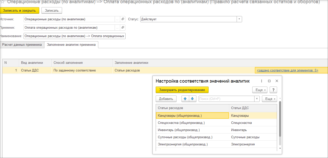 На закладке Заполнение аналитик приемника для аналитики Статьи ДДС в поле Способ заполнения выберем значение По заданному соответствию, в поле Заполнение аналитик выберем Статьи расходов. Далее введем соответствие аналитики Статьи расходов для статьи – источника «Операционные расходы» и аналитики Статьи ДДС для статьи - приемника «Оплата операционных расходов».