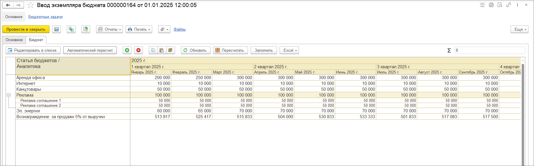 Сформируем документ Ввод экземпляра бюджета «Бюджет операционных расходов» и с помощью кнопки Заполнить рассчитаем данные по статье бюджета «Вознаграждение за продажи 5% от выручки».