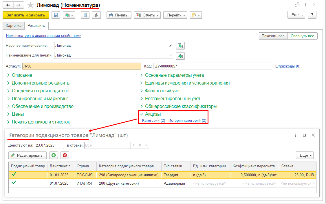 В карточке категории отображаются связанные коды классификаторов.