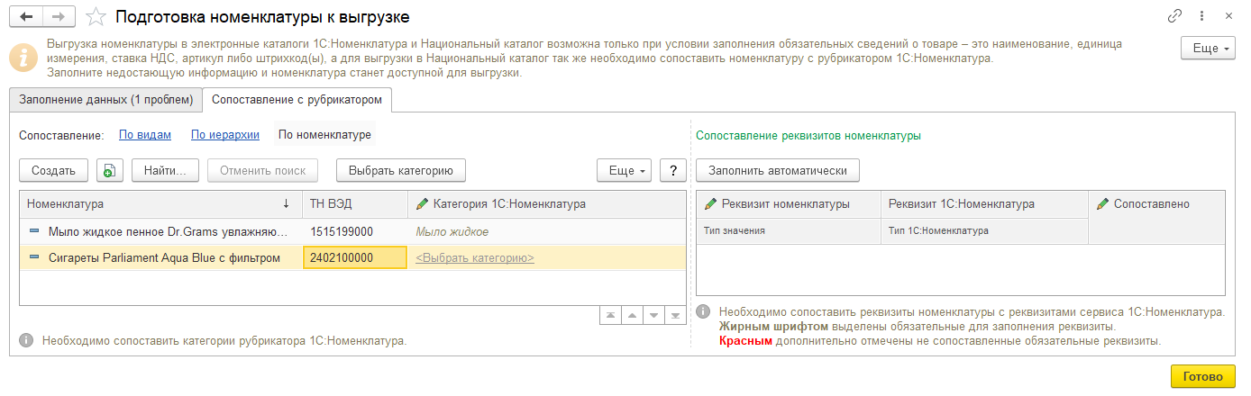 Улучшен подбор нужной категории при выгрузке номенклатуры в "Национальный каталог". При регистрации номенклатуры пользователя подбор нужной категории каталога станет эффективнее за счет поддержки поиск категорий сервиса по кодам классификаторов ОКПД2, ТНВЭД, ОКВЭД2.