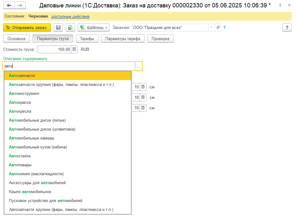 Добавлена возможность выбора описания содержимого груза из классификатора "Характер груза" перевозчика "Деловых линий".