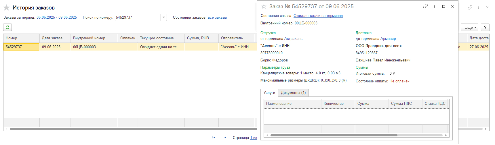 В итоговую информацию о доставке добавлен блок с выводом данных о водителе и транспорте доставки.