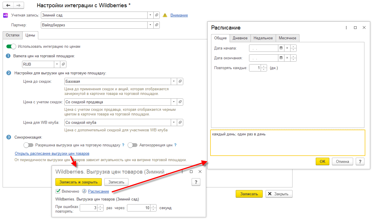 Рекомендуется настроить установку вид цен, используемый для цены с учетом скидок продавца, путем применения целочисленной скидки к базовой цене, а вид цены, соответствующий Цене для WB клуба, путем применения целочисленной скидки к цене с учетом скидки продавца. Рекомендуется установить округление с точностью до целого, в связи с особенностями работы торговой площадки Wildberries