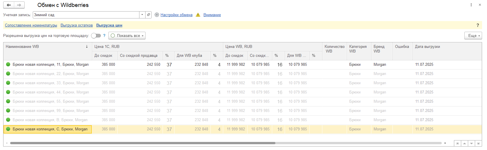 Выгрузка цен для расчета из информационной системы 1С в сервис интеграции (без публикации на Wildberries) осуществляется по ручной команде или регламентным заданем. Полная выгрузка производится при первом подключении. Для публикации цен необходимо активировать опцию Разрешена выгрузка цен на торговую площадку. Её можно включать и выключать в любой момент времени, например, это удобно для проверки произведенных расчетов перед публикацией.