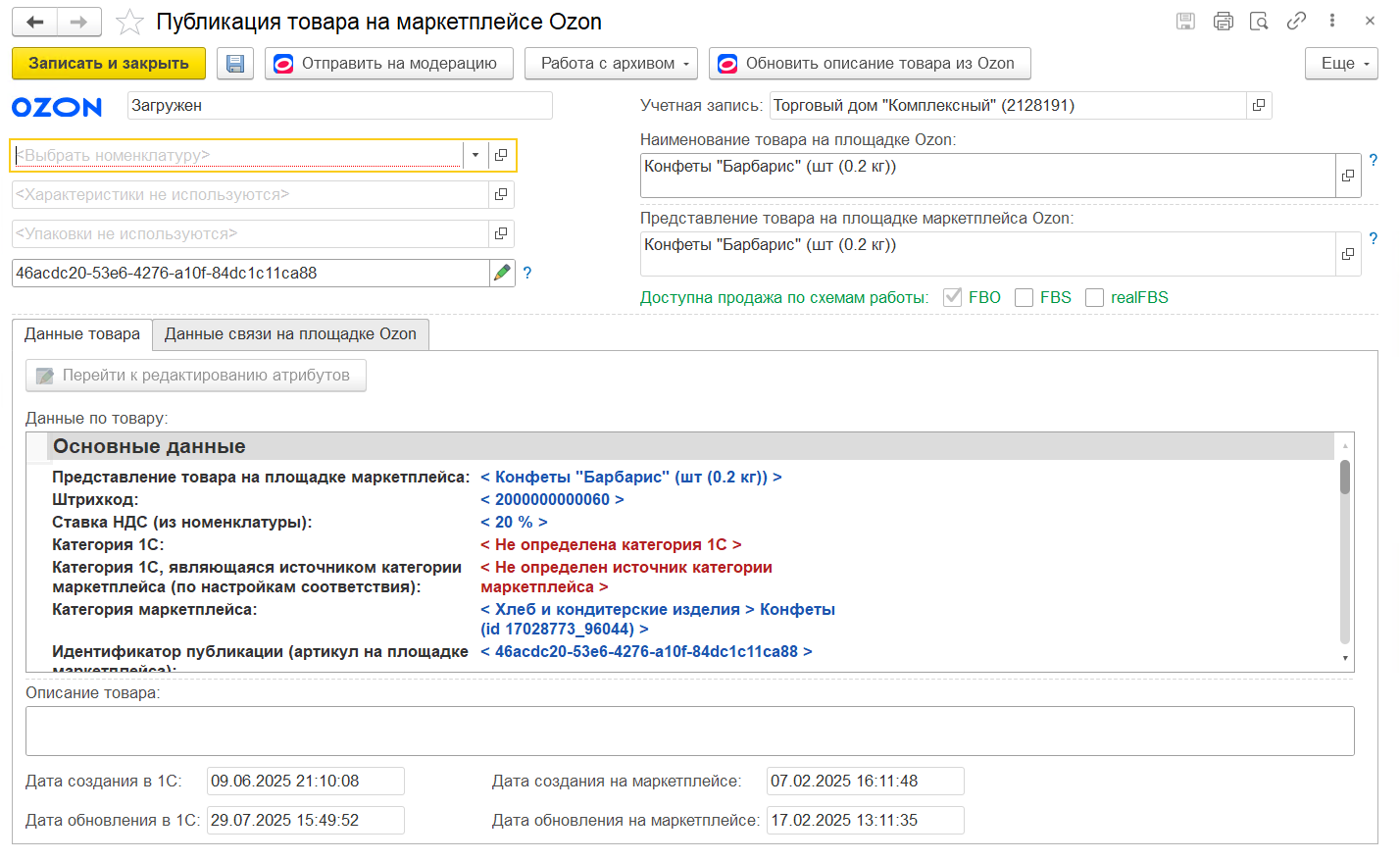 Непосредственно из карточки товара можно также актуализировать данные с торговой площадки (если они были изменены в личном кабинете на торговой площадке) командой Обновить описание товара из Ozon для любого статуса, но только для карточек, хотя бы раз прошедших модерацию (заполнен идентификатор Ozon).