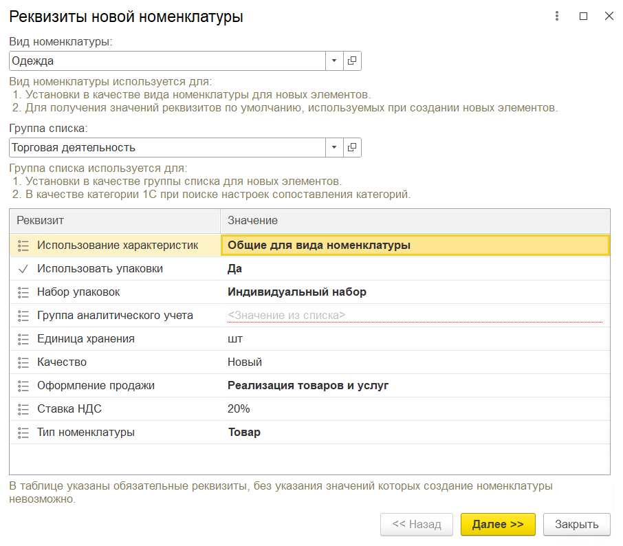 Если выделено несколько строк для создания по данным партнера, то открывается форма указания реквизитов, которые не могут быть заполнены по данным торговой площадки, включая вид номенклатуры и группу списка номенклатуры, а также иных обязательных реквизитов с учетом указанного вида номенклатуры. Указанные значения будут применены ко всем созданным элементам.