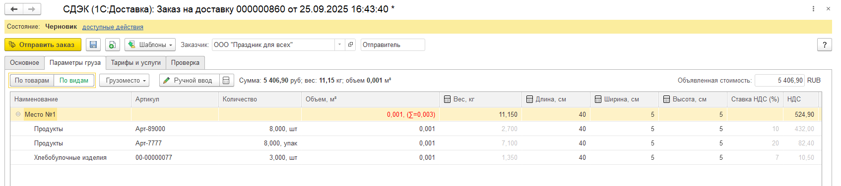 груза в заказе на доставку.