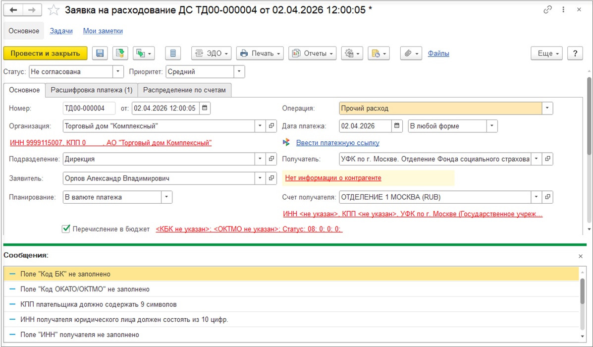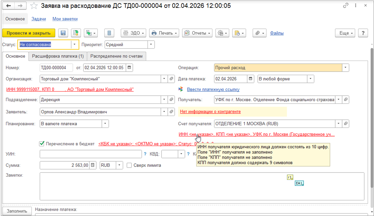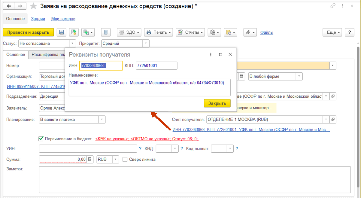 Особенности заполнения реквизитов получателя в документах Заявка на расходование ДС